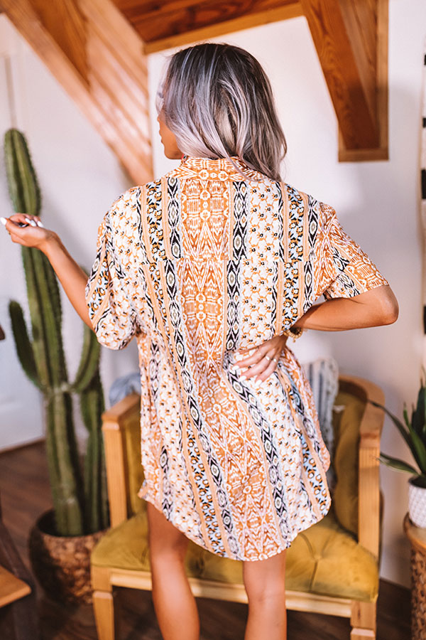 Remain eye-catching in our unique "Cafe Lounging Shift Dress" featuring lightweight material patterned with an abstract navy and golden honey hued print, a button down front with a collared v-cut neckline, short loose sleeves, accent side pockets, and a relaxed silhouette that falls into a rounded mid-thigh length hemline! We have layered this intricate piece under a jean jacket with a brown platform heel and faux leather crossbody, but you can also wear it with our "Vacation Friendly Wedge in Navy" and our "Plans In Paris Wool Hat in Cream!" Measurements