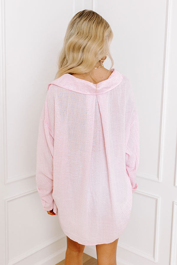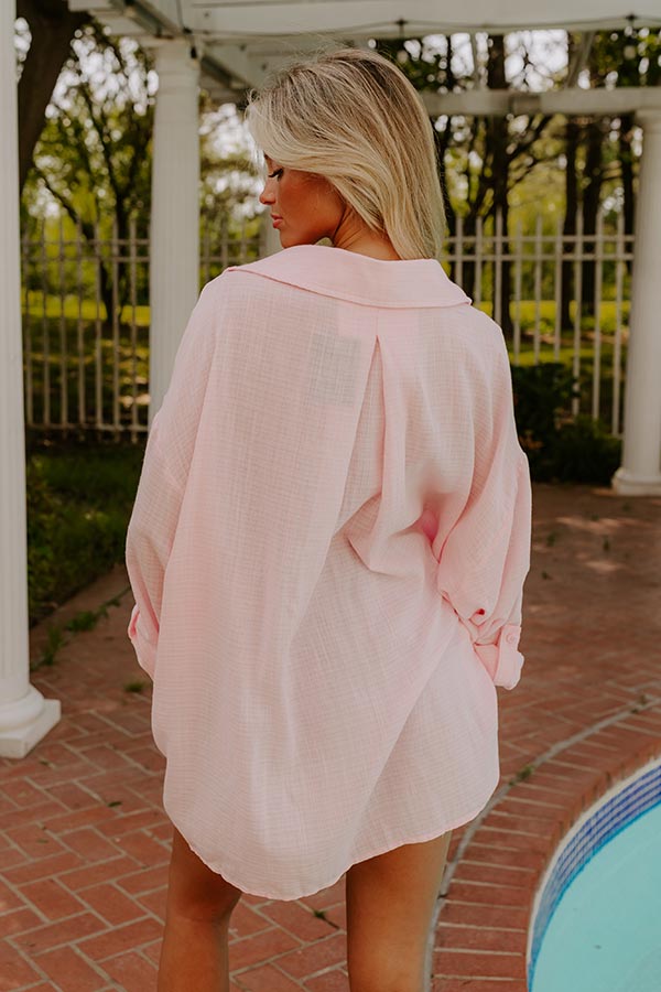 - Channel seaside chic style with this breezy button up! Its sweet collared neckline and rolled sleeves are the perfect combo of sophistication and cool laid-back vibes. Elevate your vacay wardrobe with a touch of coastal charm with this must-have piece of sunny style. - Soft unlined material - A collared v-cut neckline - A button up front - A functional chest pocket - Long sleeves that can be rolled and secured with a button at half sleeve length - A relaxed silhouette that ends in a high-low hemline