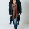 Drape yourself in style with our versatile forest colored plus size 'Cafe On Braodway Cardigan' featuring lightweight but warm knit material, long loose sleeves, and a draped open front silhouette that cascades into a straight mid-calf length hemline!