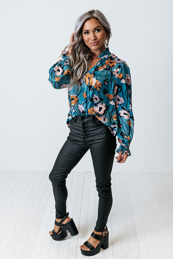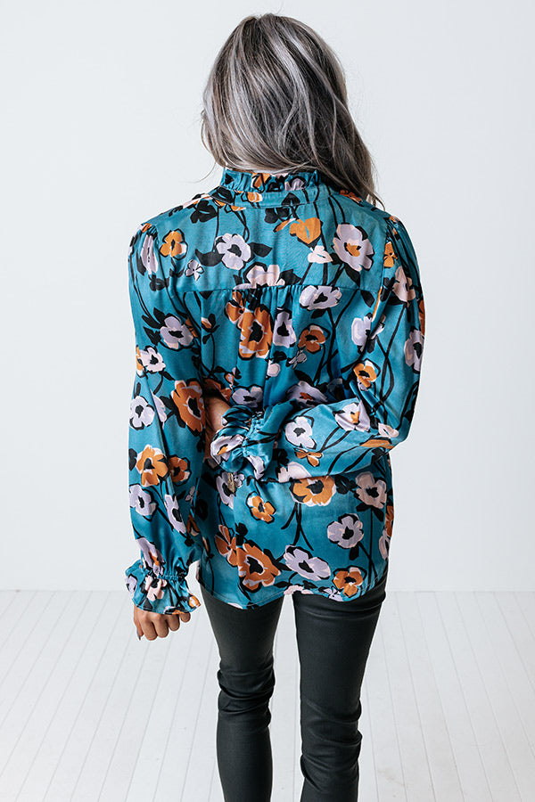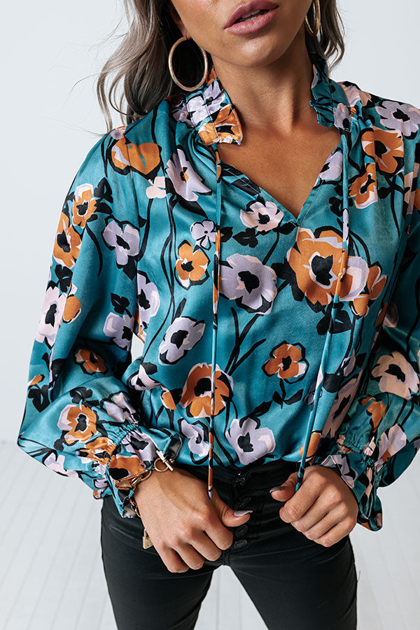 Make a vibrant entrance with our beautiful turquoise 'Cafe On Braodway' shift top featuring lightweight material patterned with a mustard, black, and light purple floral print, a v-cut neckline with a tie closure, long loose sleeves with ruffled cuffs, and a relaxed silhouette that falls into a straight hemline!