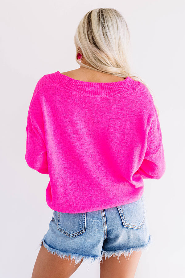 All eyes are sure to be on you when you wear our adorable neon pink "Calabasas And Chill" sweater featuring soft lightweight tight knit material with subtle ribbed trim detailing, a wide v-cut neckline, long loose sleeves with fitted cuffs, and a relaxed silhouette that falls into a straight hemline! We have styled this vibrant transitional piece with some distressed denim shorts and a matching beaded clutch, but you can also wear it with some frayed black skinnies, "The Hollis Espadrille in Hot Pink," and our "Sunshine Suite Sunnies in Black!" Measurements