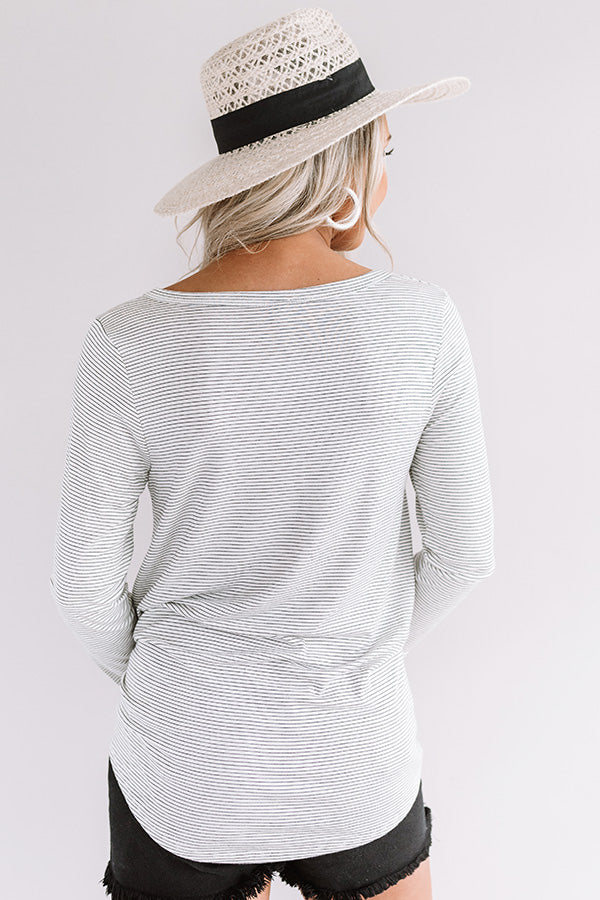 "Stripe" a pose in our casual white "Cali Calling" top featuring soft lightweight material patterned with horizontal black accent pin stripes, a button down front with a rounded neckline, long semi-fitted sleeves, and a relaxed silhouette that falls into a knotted from hemline and a straight back hem! We have styled this classic transitional piece with some frayed black shorts, wedges, and a woven hat, but you can also wear it with some distressed denim flares, "The Saylie Peep Toe Heel in Blush," and our "A Moment's Notice Crossbody in Blush!"