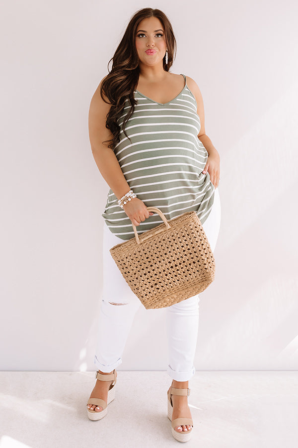 Plus Size - Keep it casual this summer with our classic sage colored "Cali Coast" shift tank featuring soft lightweight material patterned with horizontal white accent stripes, a v-cut neckline, spaghetti straps, and a relaxed silhouette that falls into a rounded hemline! You can style this upscale basic a variety of ways, like solo with some distressed white skinnies, neutral wedges, and a woven tote, or you can wear it layered under a distressed denim jacket with some black flares, sunnies, and "The Marlow Espadrille in Sage!" Measurements