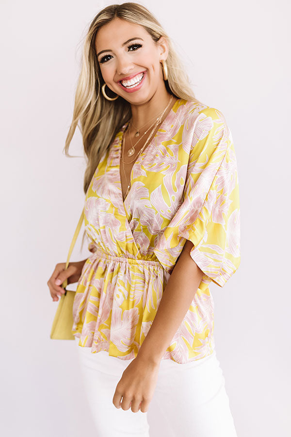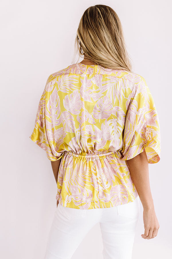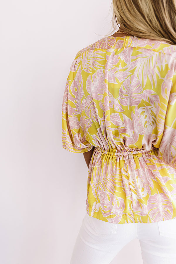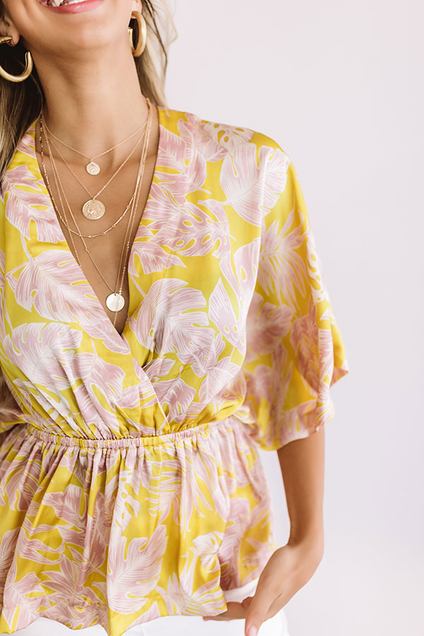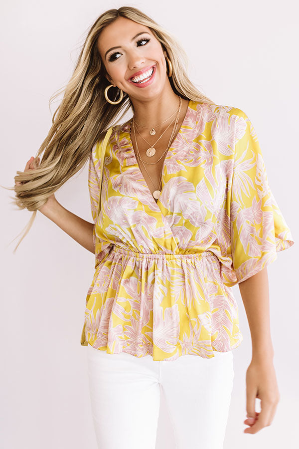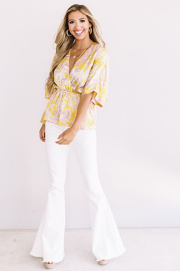 We hope all your Cali daydreams come true in this floral top with its gathered waistband, silk fabric, v-neck, and drapey sleeves! Style this satin beauty with white flared bottoms, wedges, and hoop earrings for a fashionable and composed summer look that will have you sining as bright as the sun! Measurements
