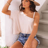 Stay cool in the Cali heat with this charming light champagne hued shift tee featuring lightweight breezy material, a diagonal neckline and upper back with two spaghetti straps on the left side and a short loose sleeve on the right, and a relaxed silhouette that falls into a straight hemline!