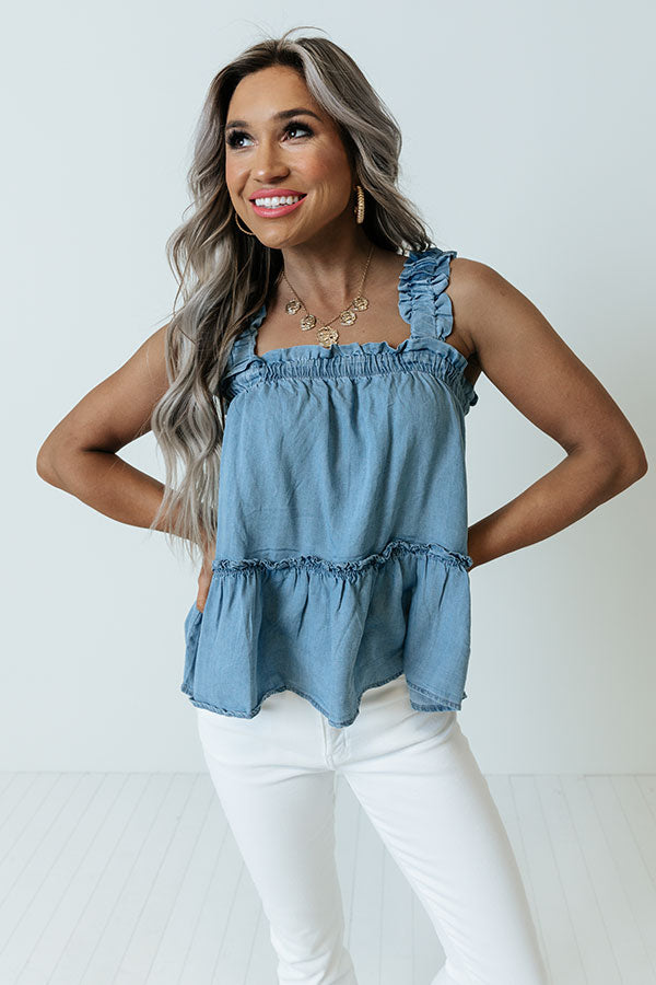 Spend your weekend in style with this flirty tank featuring lightweight medium wash chambray material, a square neckline and upper back, ruffled shoulder straps, and a relaxed peplum silhouette that falls into a straight hemline! on products