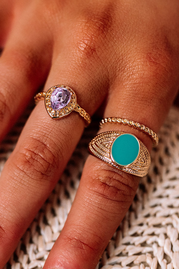 Upgrade your weekend jewelry style with this luxe gold ring set featuring three gorgeous pieces: a large textured band with a turquoise center, a thin gold band with a light purple rhinestone, and another thin gold band!