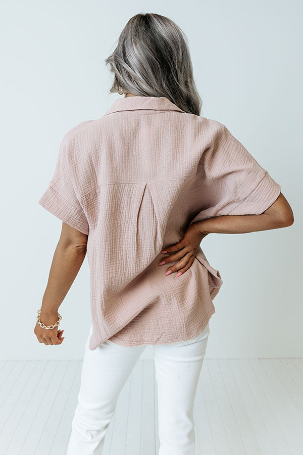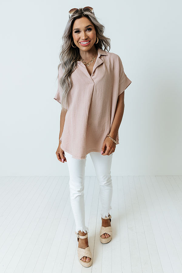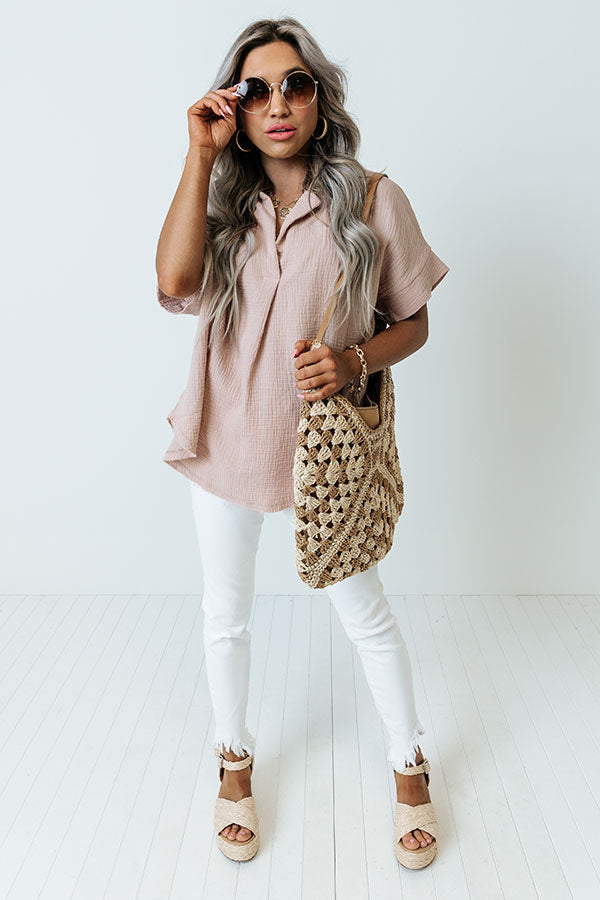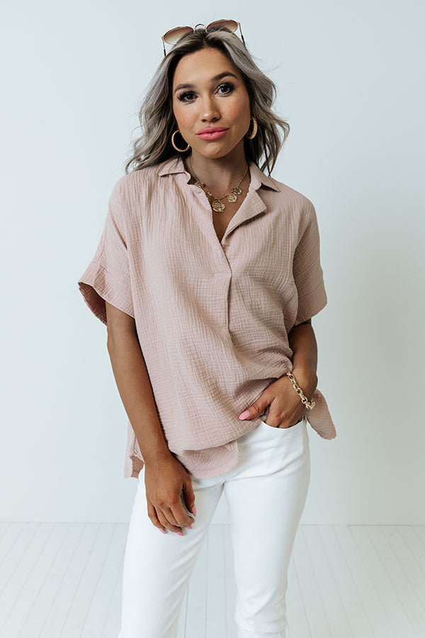 Keep your look simple but stylish with our cute blush colored 'California Cabana Shift Top' featuring lightweight material with linen-like texturing, a collared v-cut neckline, short loose sleeves with wide cuffs, and a relaxed silhouette that falls into a rounded hemline!