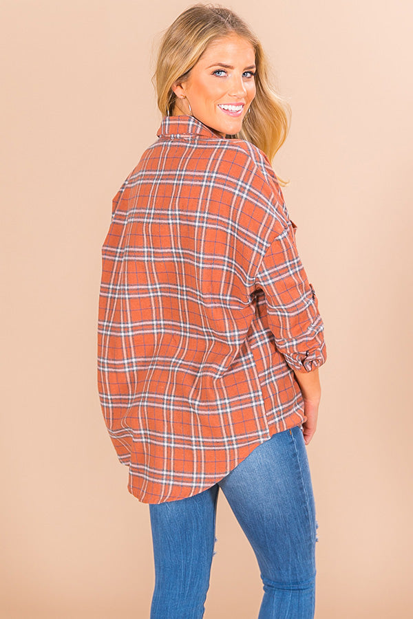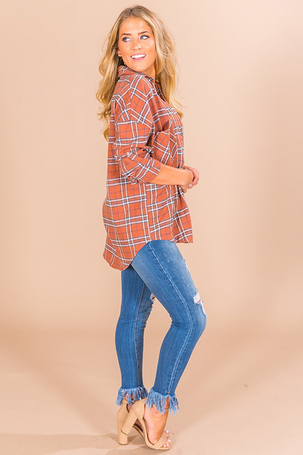 Nothing says campfire casual quite like a plaid top and this cinnamon colored one features a collared v-neckline, long roll-tab sleeves that can also be worn down, and a relaxed button-down cotton bodice with a rounded hemline that is perfect for glamping or grabbing coffee! Complete your look with distressed denim skinnies and booties, or a fur vest and beanie for a timeless look you will wear year after year!