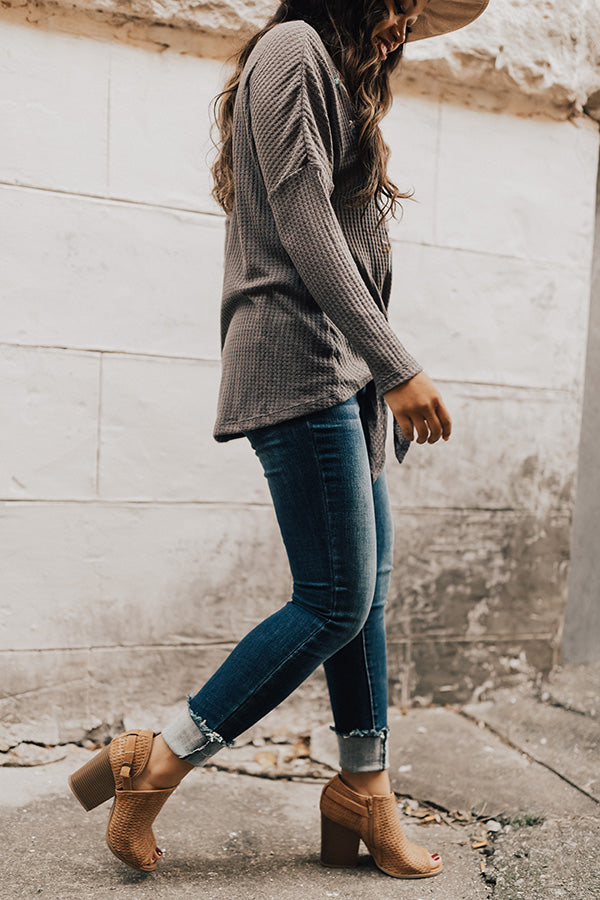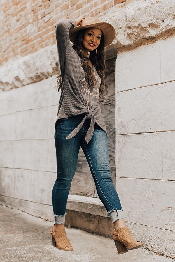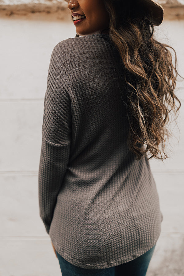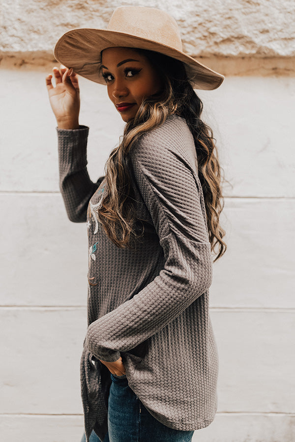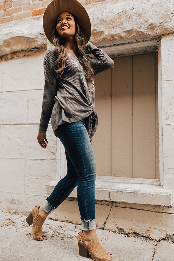 Call It Fall Embroidered Waffle Knit Top In Dark Grey