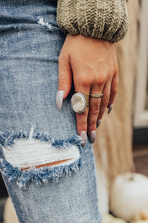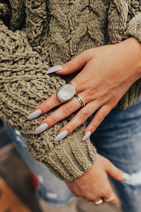 Add an angelic touch to your look by accessorizing with this glamorous ring featuring a large druzy stone surrounded by tiny shimmering rhinestones on a wide adjustable silver band setting! Due to this being a natural stone there may be some variations in color, shape, and size.