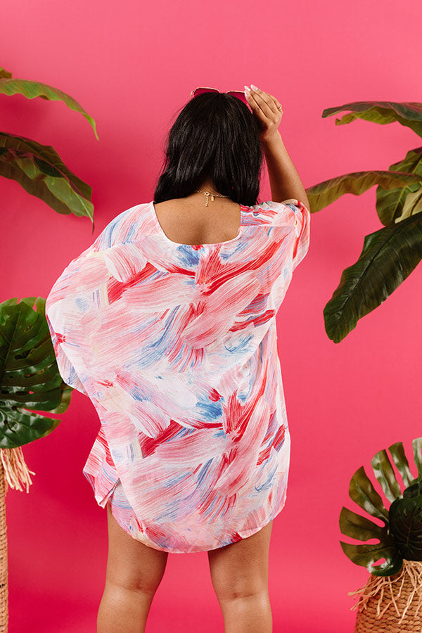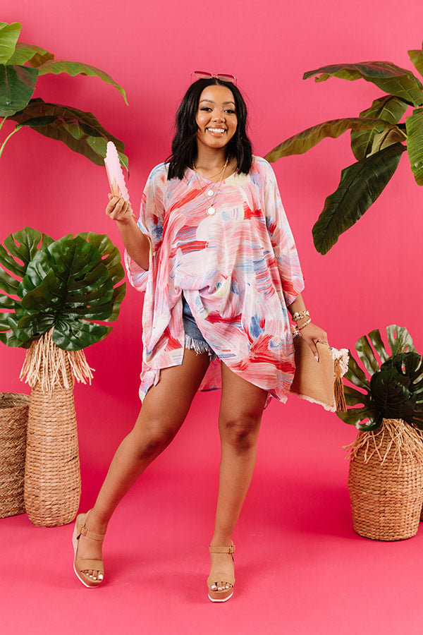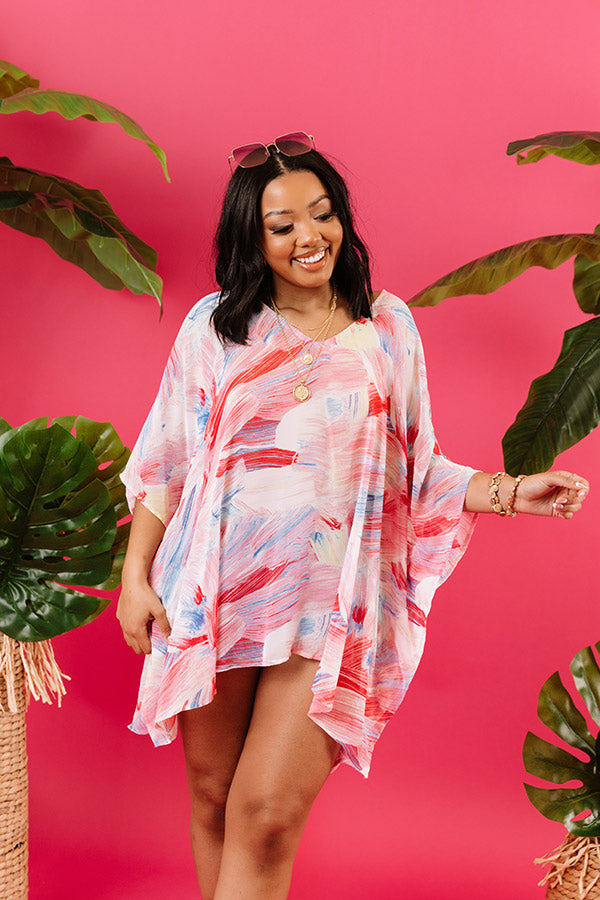 Step up your summer style game with our adorable 'Call The Haute-Line' tunic featuring ultra lightweight semi-sheer material with an abstract pink and blue pattern, a wide v-cut neckline that can be worn off one shoulder, oversized batwing half sleeves, and a relaxed silhouette that falls into a high/low hemline! Measurements