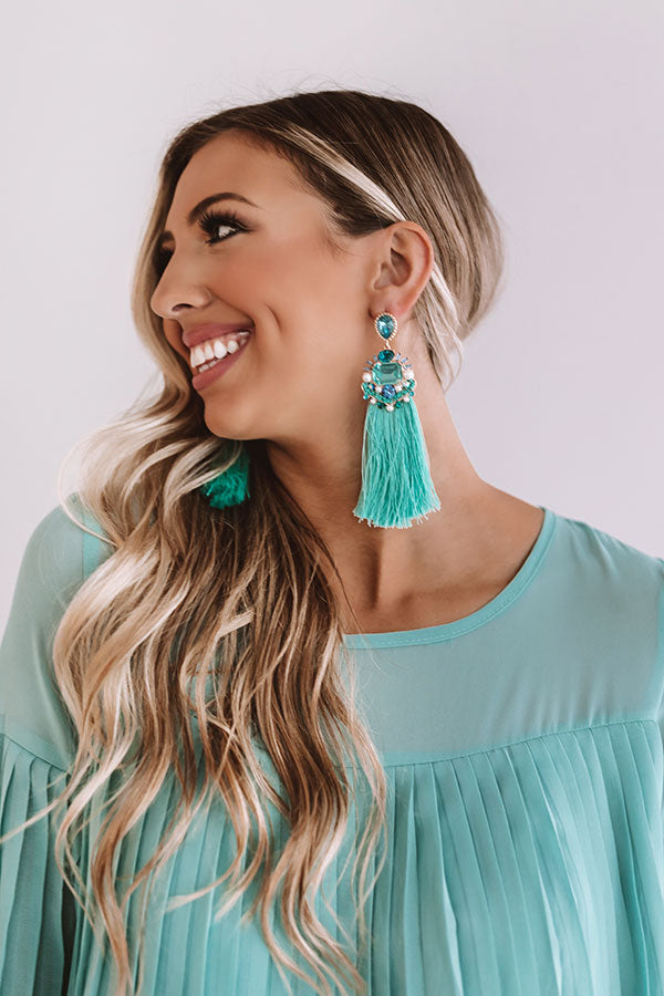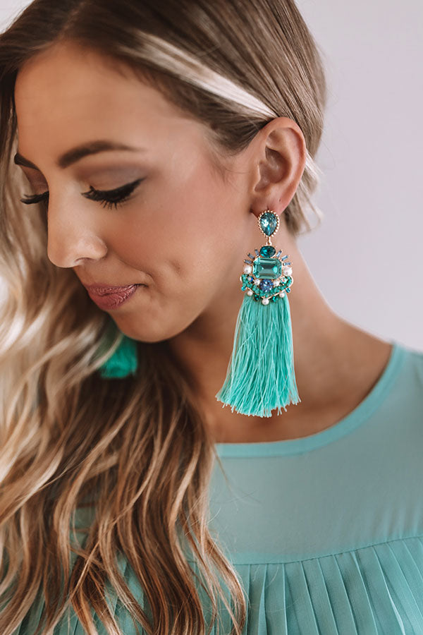 The beauty of these earrings calls for celebration because the turquoise beaded and jeweled clusters and oversized tassels will have your ears looking lively and extravagant this summer!