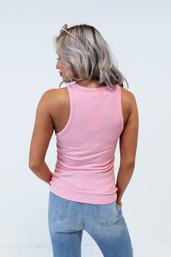 Keep your look simple but versatile in our basic pink 'Calmer Days' tank featuring lightweight four-way stretch material with subtle vertical ribbed texturing, a rounded neckline, 1-inch sleeveless shoulder straps with a racerback fit, and a flattering figure hugging silhouette that ends a straight hemline! on products