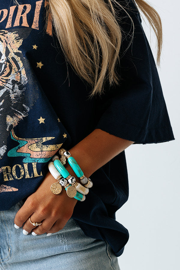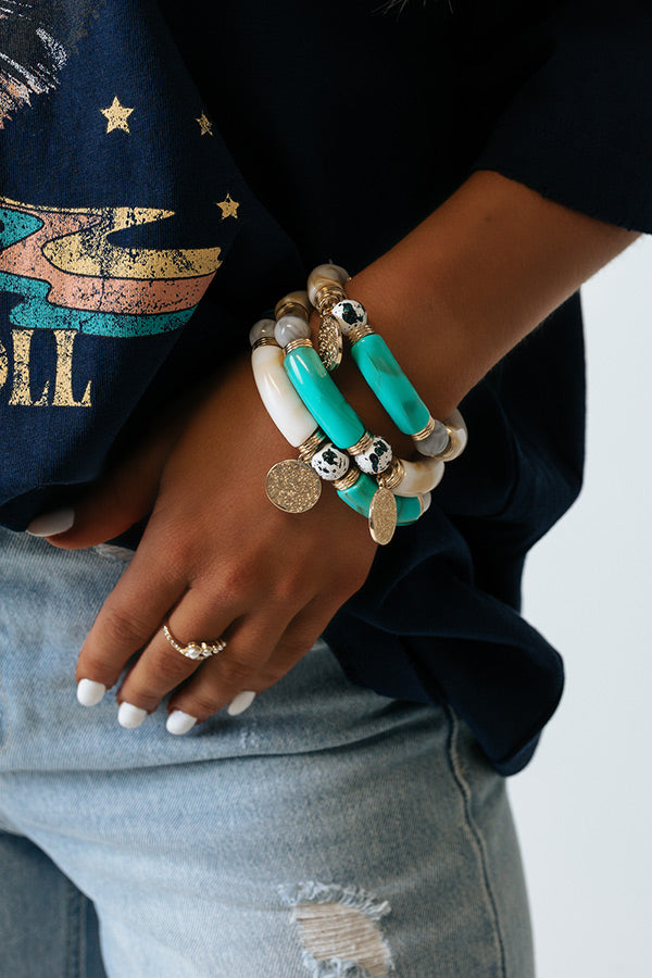 Add a pop of color to your look with our pretty 'Calm Waters Bracelet' featuring a turquoise and white resin stretch band with silver ball accents and gold coin charm detailing! Each bracelet sold separately.