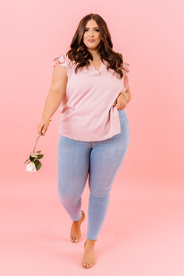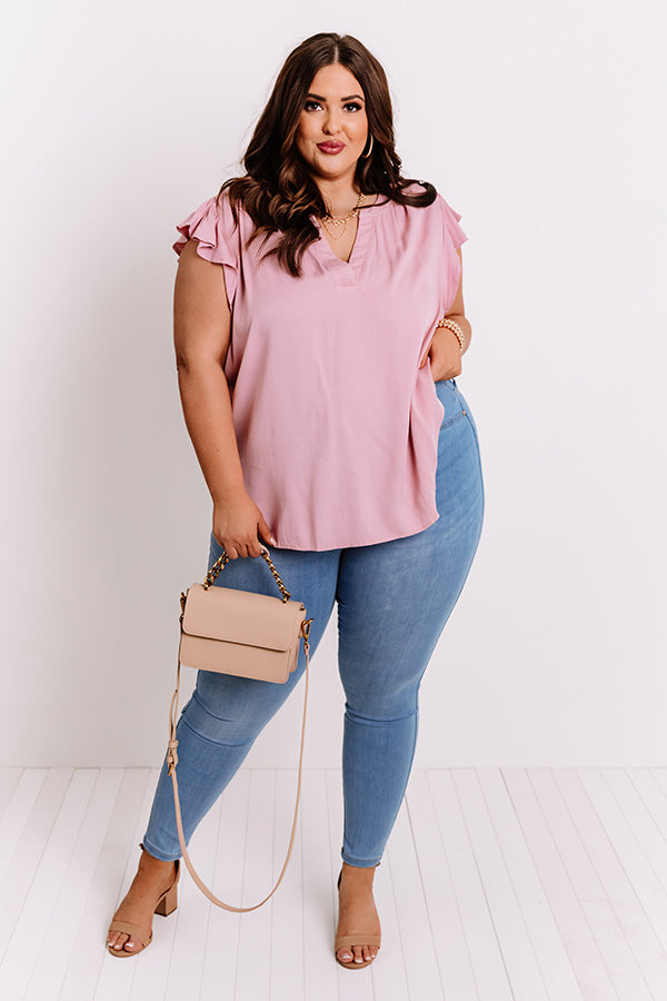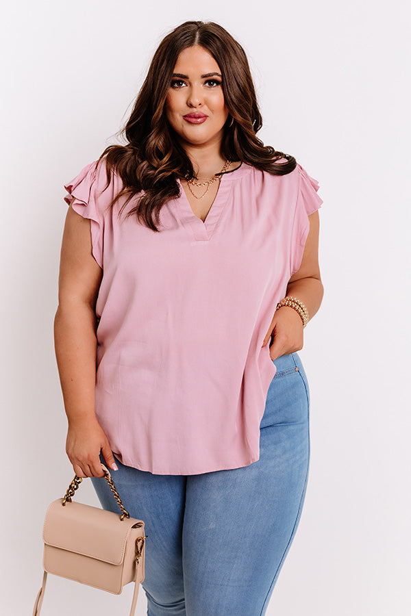 Plus Size - You are sure to be someone's crush when you wear this darling pink shift top featuring lightweight breezy material, a high rounded neckline with a v-notched cutout, short ruffled cap sleeves, and a relaxed silhouette that falls into a rounded hemline! Measurements