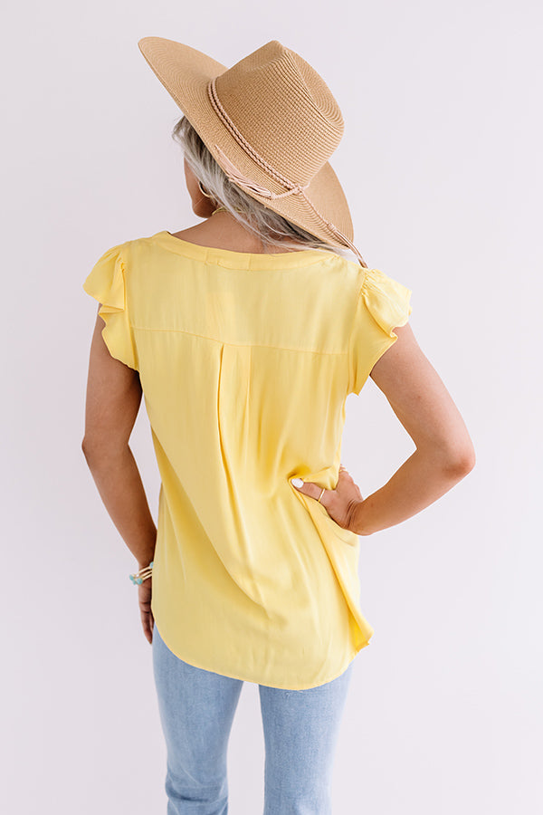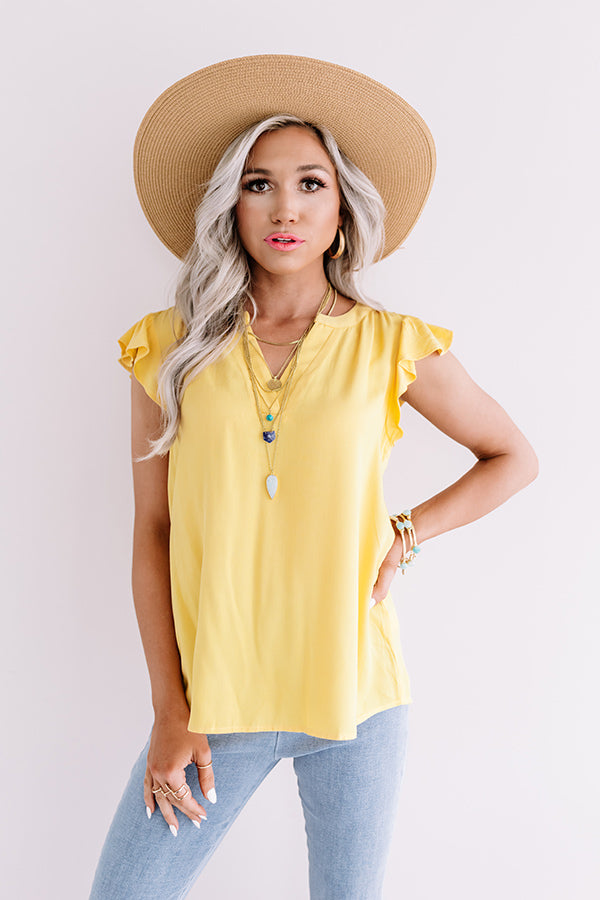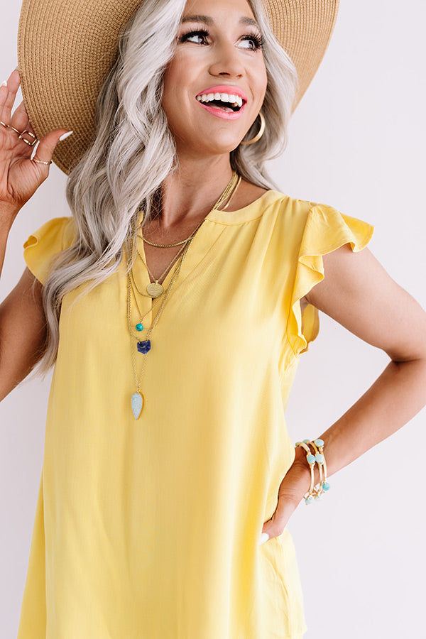 You are sure to be someone's crush when you wear this darling yellow shift top featuring lightweight breezy material, a high rounded neckline with a v-notched cutout, short ruffled cap sleeves, and a relaxed silhouette that falls into a rounded hemline! We have styled this casual cutie with some light wash flares, brown heels, a woven hat, and a leopard tote, but you can also wear it with some frayed white shorts and "The Brighton Espadrille in Yellow!" Measurements