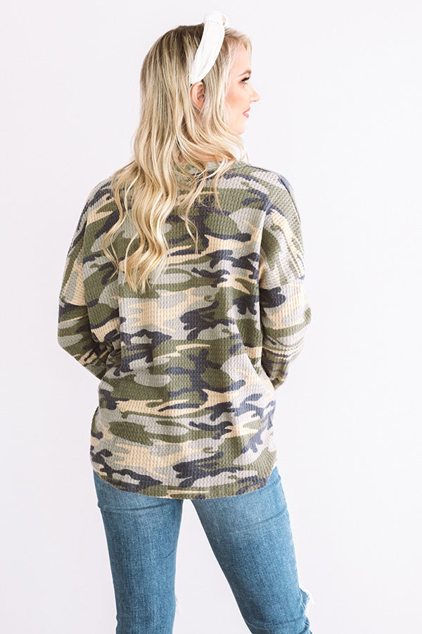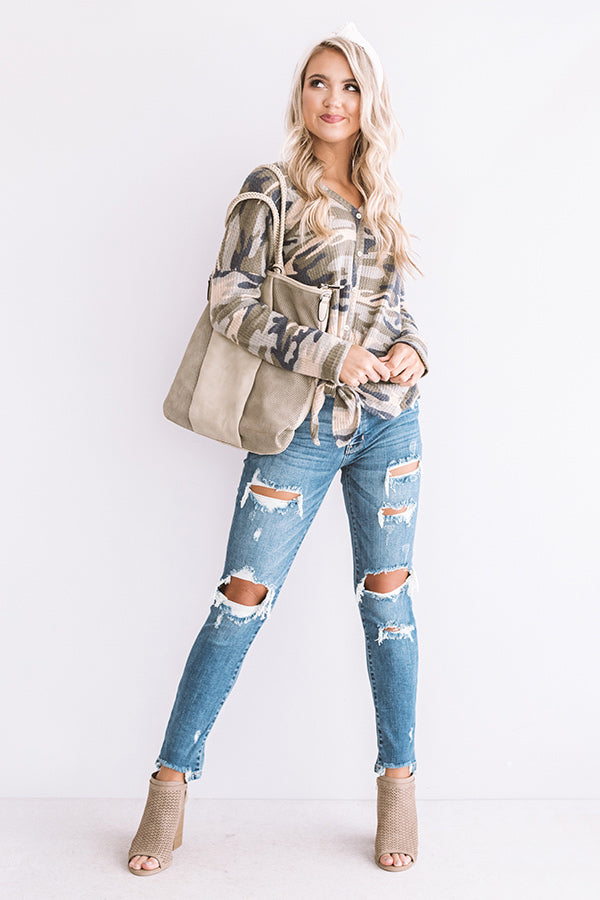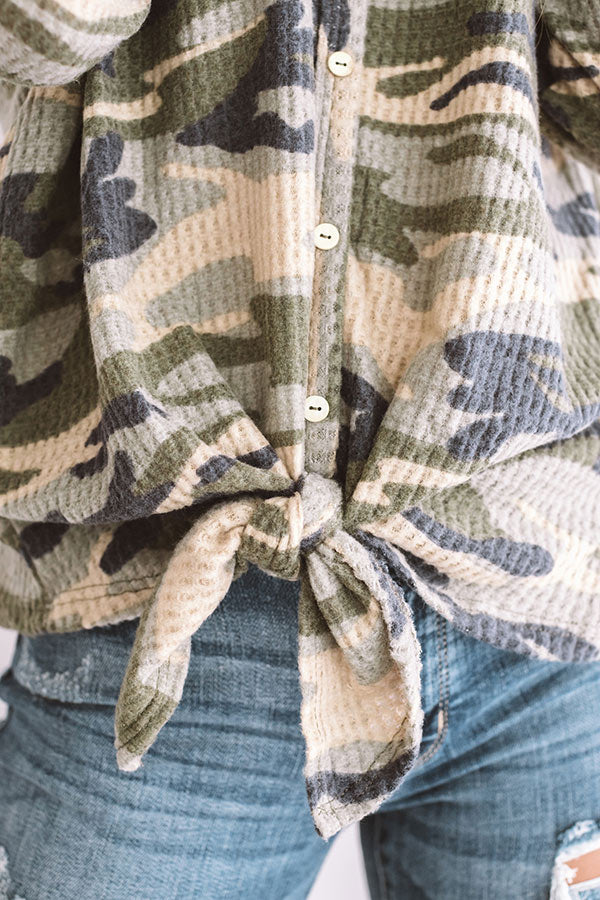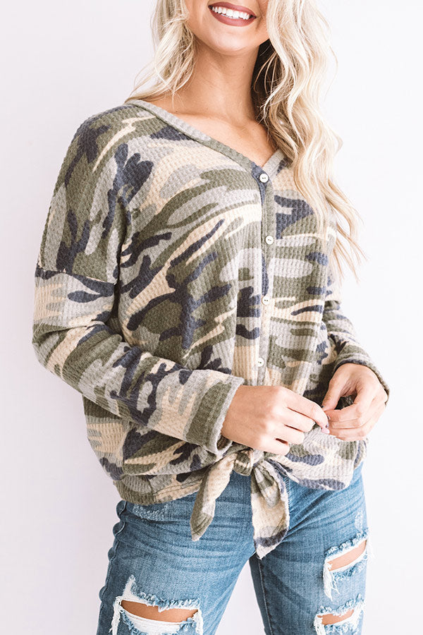 You are sure to be seen when you wear this unique top featuring lightweight material with a subtle waffle knit texture, an adorable camo pattern, long loose sleeves, a v-cut neckline, and a relaxed button up bodice that falls into a tied front hemline and a rounded back hem! This edgy transitional piece styles perfectly with some distressed ankle skinnies, a neutral peep toe bootie, an ivory headband, and a matching sage colored tote, but it can also be worn with some black flares, "The Seraphina Faux Leather Wedge in Grey," and our "Summer in Versailles in Grey!" Measurements