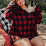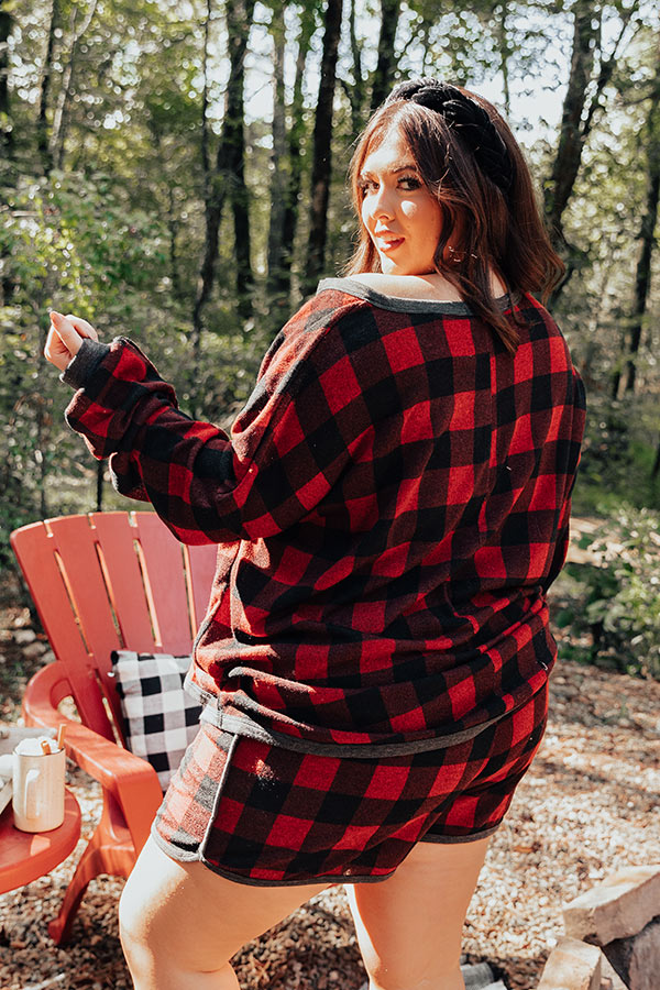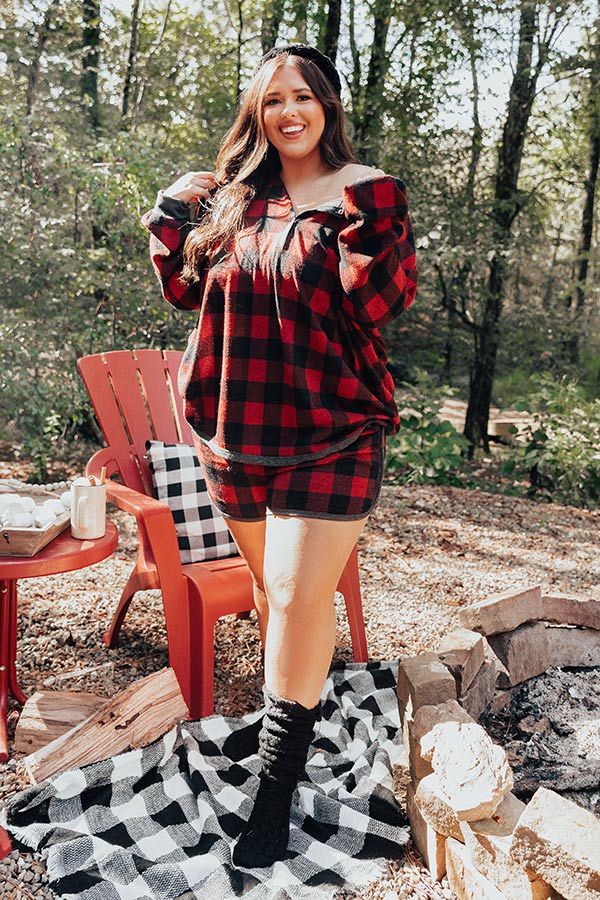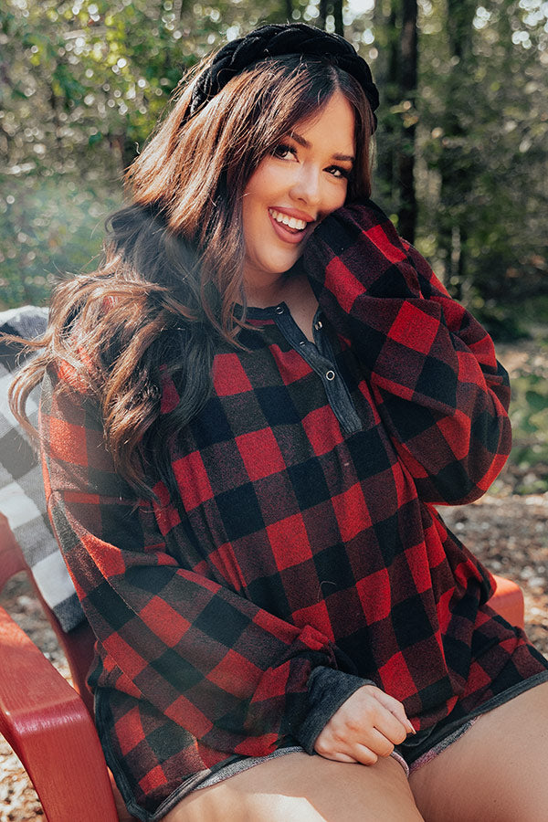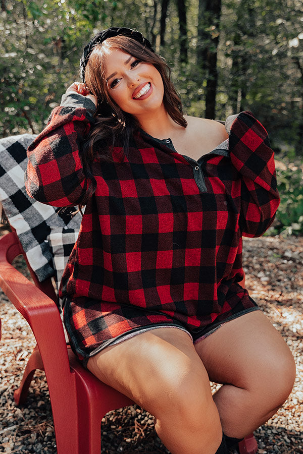 Plus Size - Cozy up in front of the fire in this adorable top featuring ultra soft lightweight material with a black and red buffalo check pattern, a button up bodice with a rounded neckline that can be worn off one shoulder, long loose sleeves with fitted cuffs, and a slouched silhouette that falls into a rounded hemline! This cozy piece styles perfectly with our "Campfire Cozies Buffalo Check Shorts" or "Campfire Cozies Buffalo Check Joggers" for the ultimate two-piece cold weather lounge look!