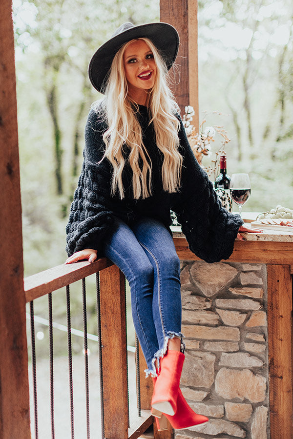 You are sure to be somebody's crush when you wear this charming black sweater featuring ultra soft and thick tight knit material, a high rounded neckline, long oversized sleeves with fitted cuffs and large bubbled texturing, ribbed trim detailing, and a relaxed silhouette that falls into a straight hemline! Measurements