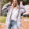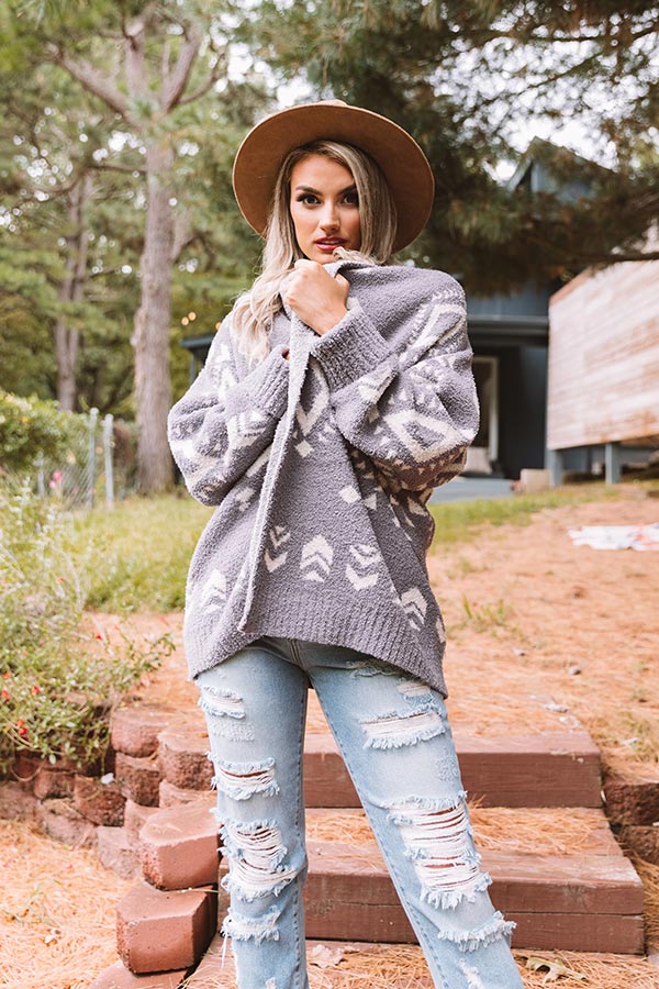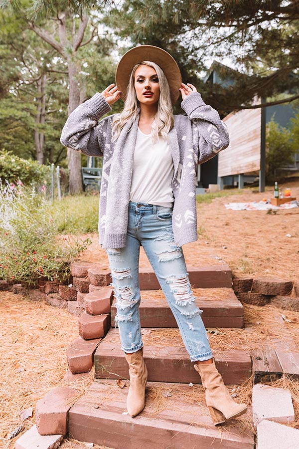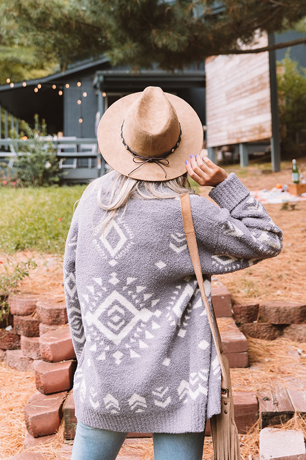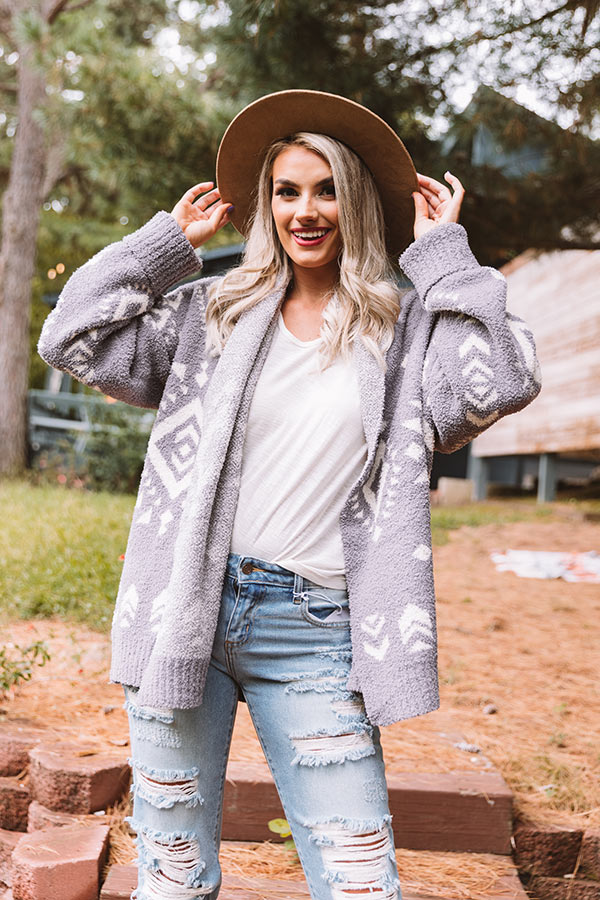 Snuggle up for a crisp fall evening with our charming grey "Campfires And Friends Cardigan" featuring ultra soft and thick fuzzy material patterned with a white aztec pattern, long oversized sleeves with ribbed cuffs that can be rolled, and a relaxed open front silhouette that falls into a straight mid-thigh length hemline!