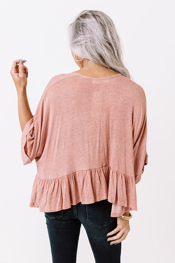 Swooning over 'The Campus Stroll Shift Top' whose boxy silhouette falls into a loose and sweet ruffled peplum. This top features a crew neckline, wide 3/4" sleeves with a stitched cuff, and a stretchy fit.