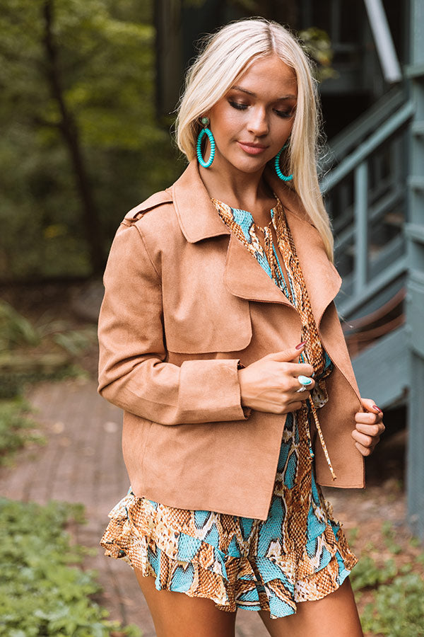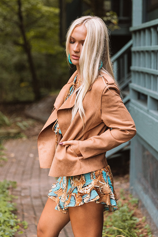 We're sure that we'll be able to "suede" you to add this chic camel colored blazer to you cart when we tell you it features soft lightweight material, a notched flap collar neckline, long semi-loose sleeves with zip closure cuffs, buttoned shoulder straps, and a relaxed open front silhouette that falls into a straight hemline! If you still aren't convinced then believe us when we say it can be styled a variety of ways during every season! Measurements