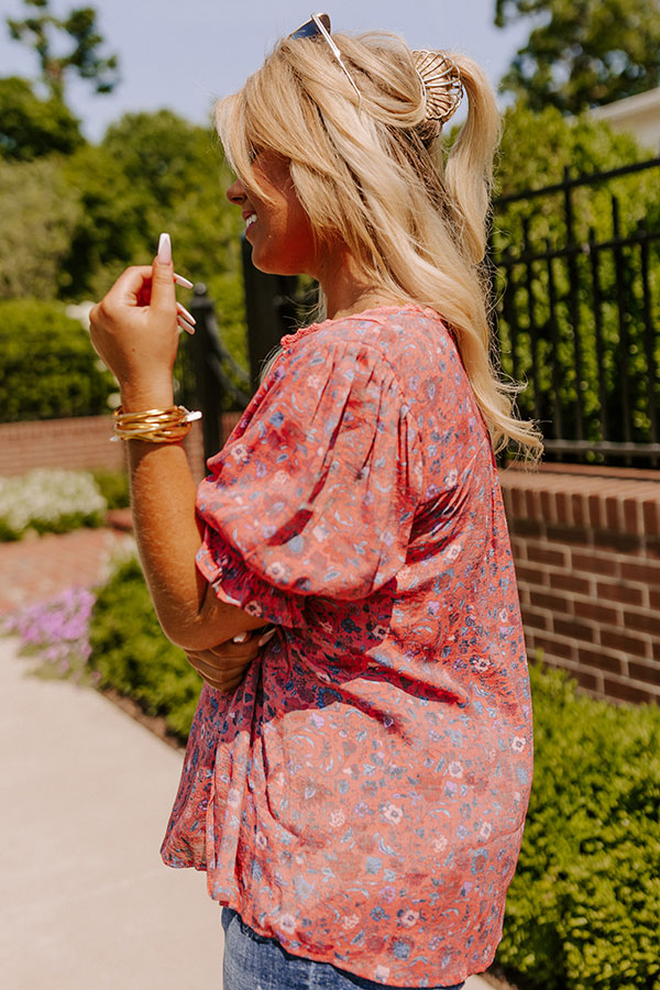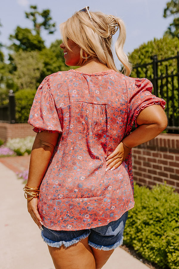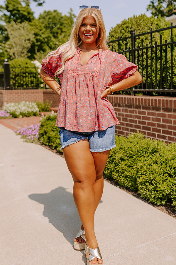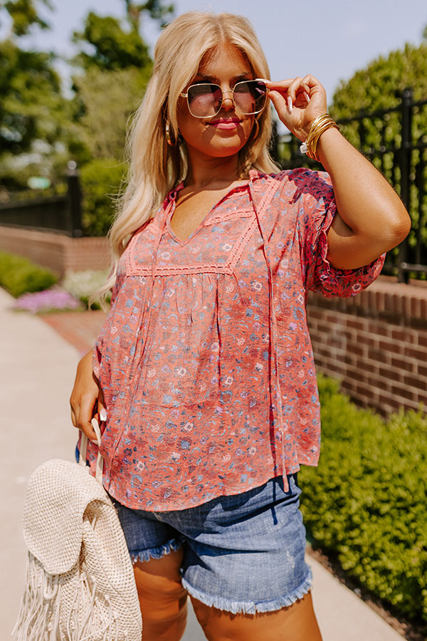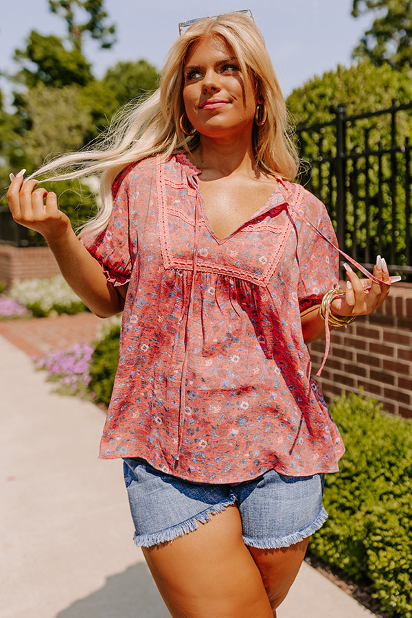 Slay all day in our pretty coral colored plus size 'Candid Feelings' shift top featuring lightweight material patterned with a blue floral print, a tie closure v-cut neckline with subtle ruffle trim detailing, short puff sleeves, and a relaxed silhouette that falls into a straight hemline!