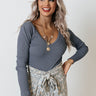 Upgrade your wardrobe basics with our versatile airy blue colored 'Candy Apple Dipped' top featuring lightweight stretchy material with vertical ribbed texturing, a v-cut neckline and upper back, long sleeves, and a flattering figure hugging silhouette that ends in a straight hemline!