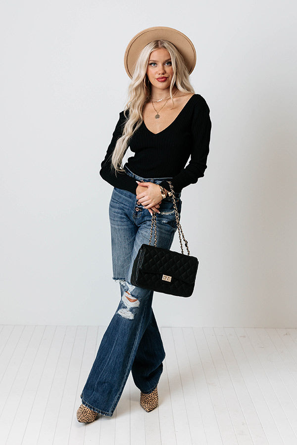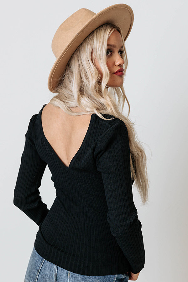 Upgrade your wardrobe basics with our versatile black 'Candy Apple Dipped' top featuring lightweight stretchy material with vertical ribbed texturing, a v-cut neckline and upper back, long sleeves, and a flattering figure hugging silhouette that ends in a straight hemline!
