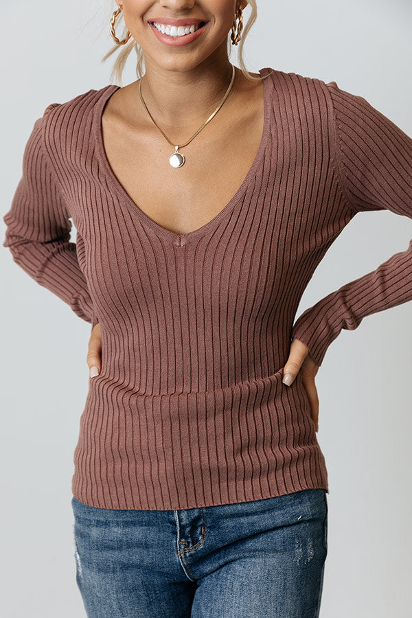 Upgrade your wardrobe basics with our versatile vineyard grape colored 'Candy Apple Dipped' top featuring lightweight stretchy material with vertical ribbed texturing, a v-cut neckline and upper back, long sleeves, and a flattering figure hugging silhouette that ends in a straight hemline!