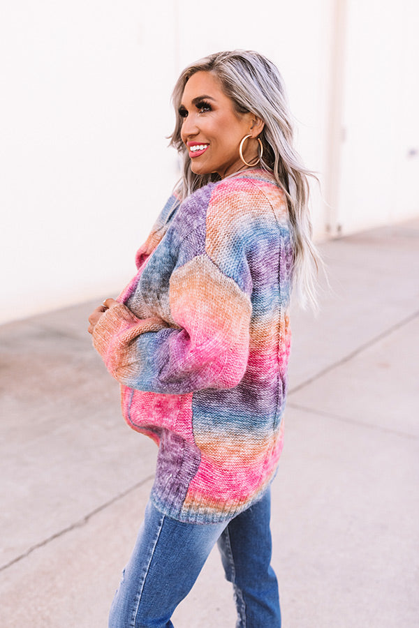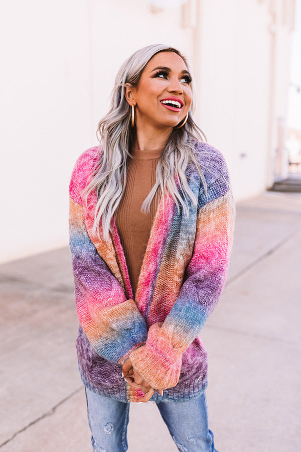 Sweeten up your spring wardrobe with our colorful pink 'Candy Coated' cardigan featuring soft lightweight tight knit material with horizontal rainbow stripes, ribbed trim detailing, an oversized fit, long loose sleeves, and a relaxed silhouette. Pair with skinny jeans, a basic tee, and hoops for a look you'll keep crushing on! Measurements