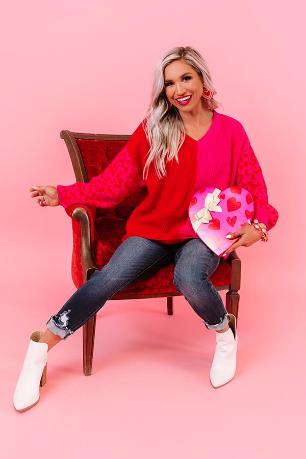We have no doubt people will be crushing on you when you arrive in this darling sweater featuring soft lightweight tight knit material with red and hot pink color block halves, a v-cut neckline, long loose sleeves with fitted cuffs and patterned with a subtle leopard print, and a slouched silhouette that falls into a straight hemline!