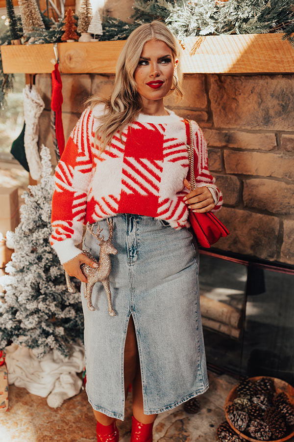 Stay on trend this holiday season with our cute white plus size 'Candy Lane Sweater' featuring warm eyelash knit material patterned with large solid red and diagonal red striped squares, a rounded neckline, long loose sleeves, and a slouched silhouette that falls into a straight hemline! Measurements