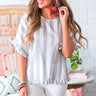 From coast to coast, the "Cannes Chic Stripe Shift Top" is loved the most! This classic cutie has a relaxed cotton bodice & an ultra feminine ruffled sleeve & bottom hem. Style with white skinnies for a chic polished look that would be great for brunch at the yacht club, or add a pop of color to your look with some fun red accessories for your next patio party!