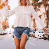 We can't help but crush on this adorable white top featuring lightweight semi-sheer lace material, a high rounded neckline, loose 3/4-length sleeves with flared forearm cuffs, a keyhole accented upper back with a button closure, and a flattering peplum silhouette that ends in a straight hemline! Measurements
