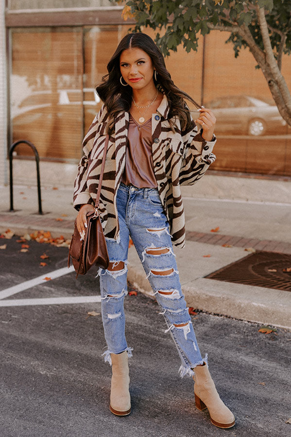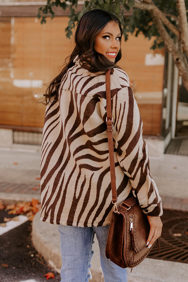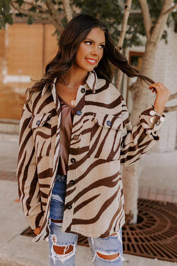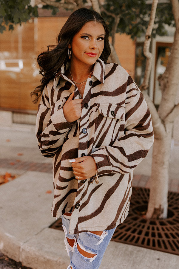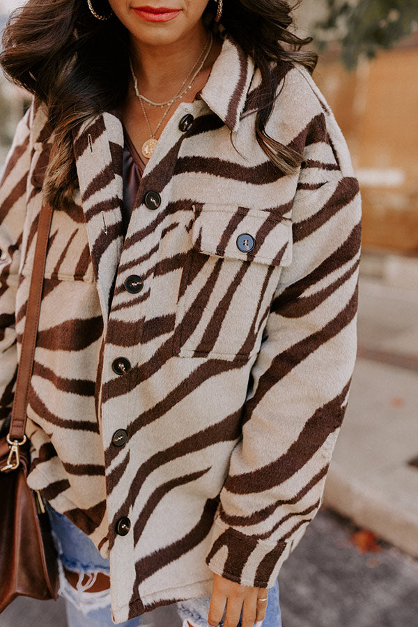 We can't help loving this trendy jacket! Features a warm beige colored polyester material patterned with a brown zebra print, buttoned up front with a collared neckline, long sleeves with button closure cuffs, two chest pockets, and a relaxed flattering silhouette that falls into a straight hemline.