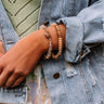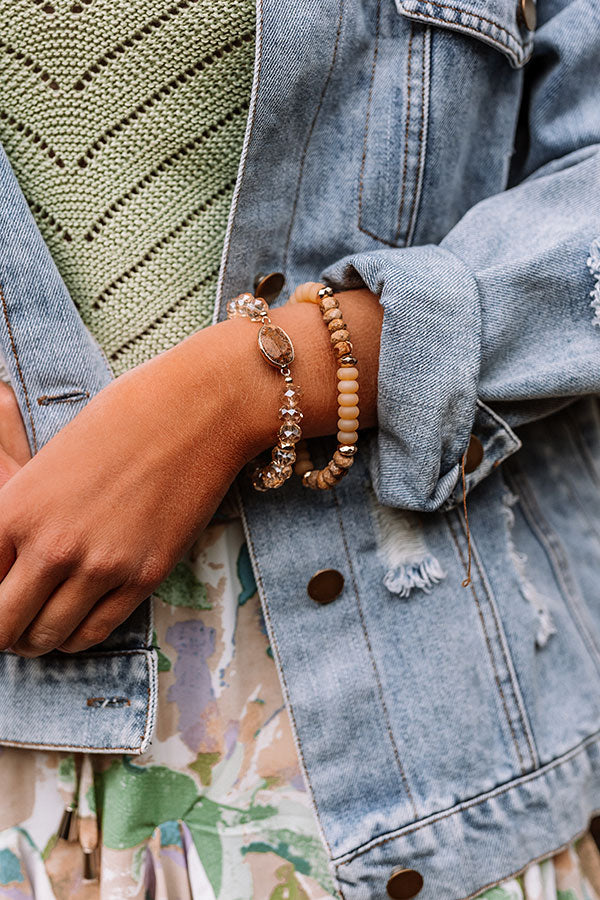 Upgrade your arm candy stack with our pretty 'Canyon Bay Bracelet Set' featuring two beige, gold, and clear beaded stretch strands!