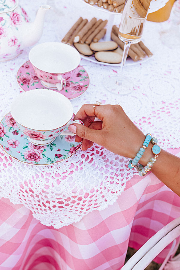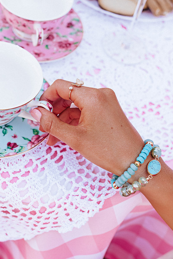 Upgrade your arm candy stack with our pretty 'Canyon Bay Bracelet Set' featuring two turquoise and gold beaded stretch strands!