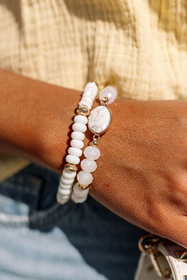Upgrade your arm candy stack with our pretty 'Canyon Bay Bracelet Set' featuring two white and gold beaded stretch strands!
