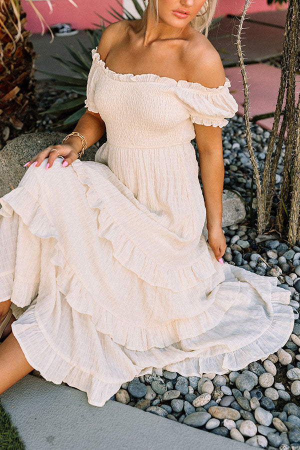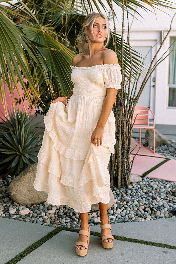Stay wild flower child in our stunning cream colored 'Canyon Bay Midi Dress' featuring lightweight flowy material, ruffled trim detailing and accent seams throughout, a straight off-shoulder neckline, short subtly puffed cap sleeves, and a relaxed tiered skirt silhouette that cascades into an uneven mid-calf length hemline!