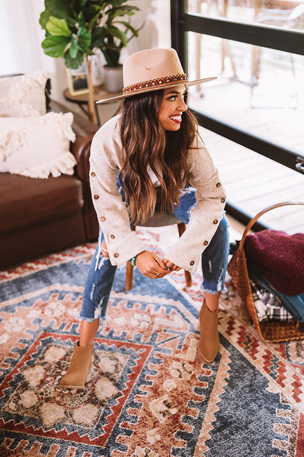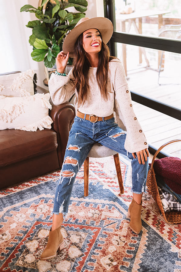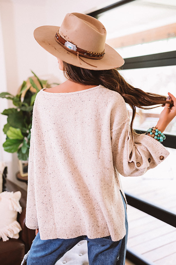 You are sure to "fall" in love with our adorable cream hued "Cappuccino Cozy" sweater featuring ultra soft lightweight tight knit material, a high hemline, long loose button down sleeves with flared cuffs, ribbed trim detailing, and a relaxed silhouette that falls into a straight hemline with high accent side slits! Measurements