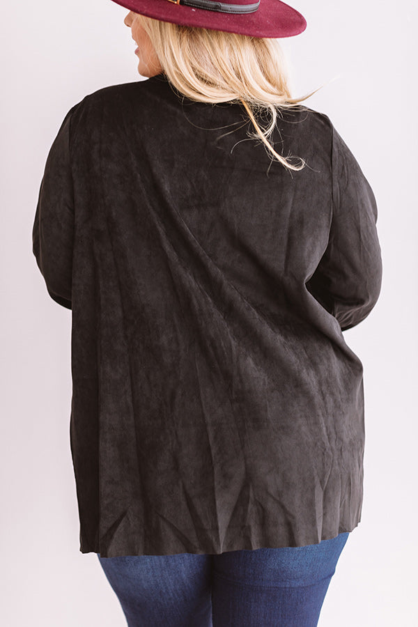 Plus Size - Haven't you heard? Our favorite fall piece is back! The "Cappuccino Crushing" jacket features a faux suede material, a light weight fit, an open front with accent flaps, an asymmetrical hem, and long sleeves that can be worn down or rolled and buttoned up! This black jacket is the PERFECT transition piece for all you fashionistas out there because you can style it over a bold leopard tank with some skinnies, a nude heel, and a maroon crossbody and faux suede hat or you can swap the leopard tank with a white one and switch out the heels for "The Oakley Knee High Boot in Black!"