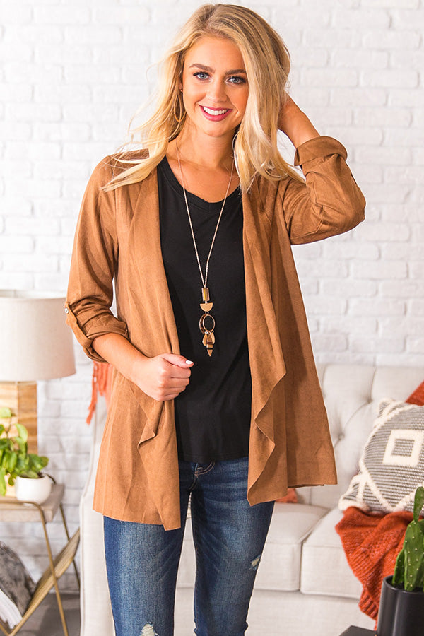 Haven't you heard? Our favorite fall piece is back! The "Cappuccino Crushing" jacket features a faux suede material, a light weight fit, an open front with accent flaps, an asymmetrical hem, and long sleeves that can be worn down or rolled and buttoned up! This tan jacket is the PERFECT transition piece for all you fashionistas out there because you can style it over a simple black tee with some distressed skinnies, a statement necklace, and a black heel, or you can swap the tee with a basic neutral tank and switch out the heels for "Thee Cadence Faux Suede Thigh High Boot!"