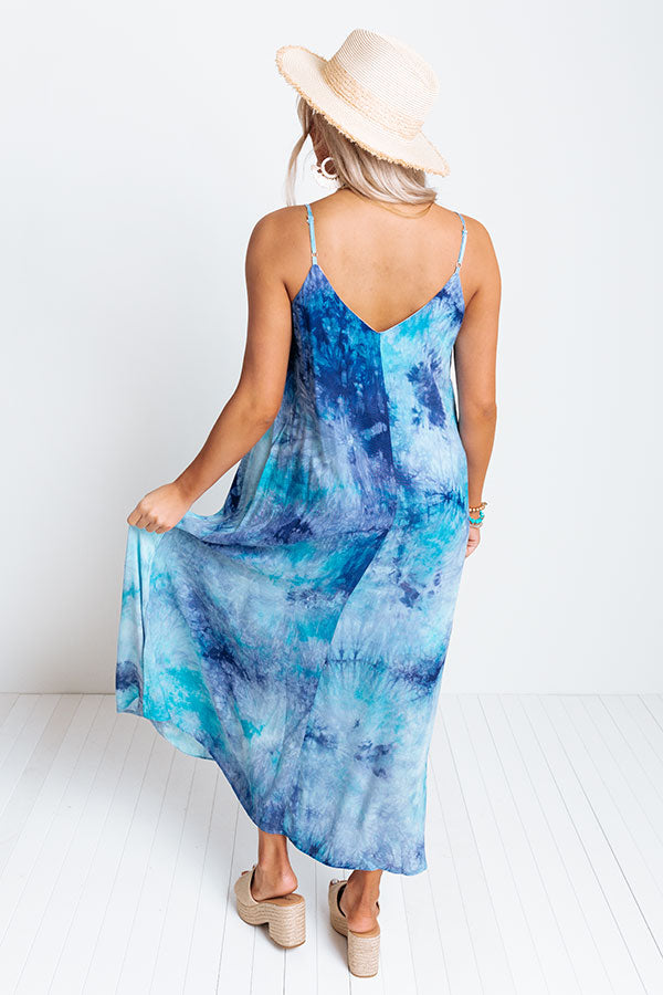 Dress to impress in our adorable 'Capri Waters' maxi dress featuring lightweight breezy material patterned with blue hued tie dye, a v-cut neckline and upper back, adjustable shoulder straps, hidden side pockets, and an ultra relaxed silhouette that cascades into a straight ankle-length hemline!