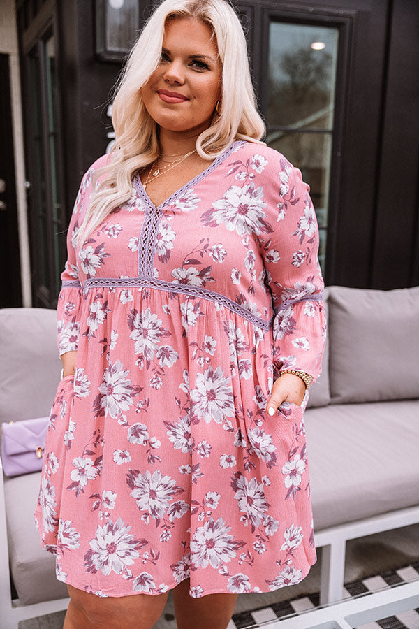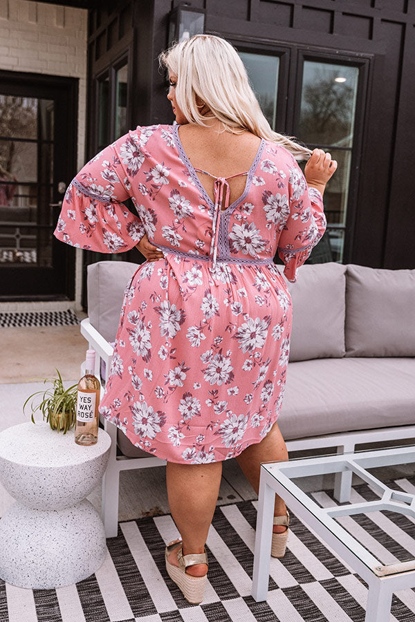 Plus Size - We have no doubt people will be captivated by this graceful pink dress featuring lightweight flowy material patterned with a large floral print, a v-cut neckline and upper back with a tie closure, dainty purple crochet detailing throughout, loose 3/4-length sleeves with flared cuffs, and a flattering bodice that falls into a flowy skirt silhouette with a straight mid-thigh length hemline! Measurements