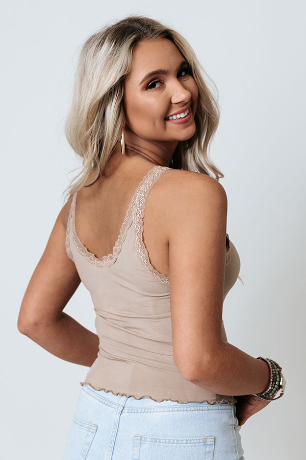 Capture the moment in style with this upscale tape colored tank featuring lightweight and stretchy material with subtle vertical ribbed texturing, a scooped neckline and upper back with intricate lace trim detailing, sleeveless shoulder straps, and a flattering form fitting silhouette that ends in a scalloped hemline! Measurements