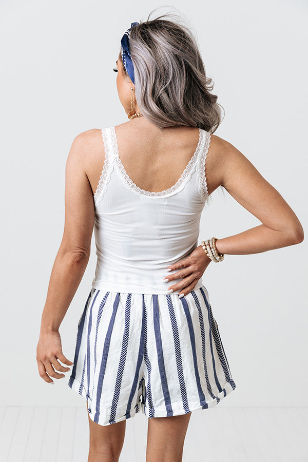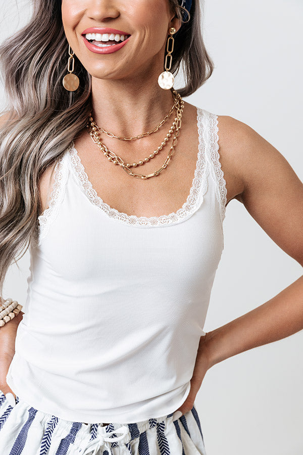 Capture the moment in style with this upscale white tank featuring lightweight and stretchy material with subtle vertical ribbed texturing, a scooped neckline and upper back with intricate lace trim detailing, sleeveless shoulder straps, and a flattering form fitting silhouette that ends in a scalloped hemline!