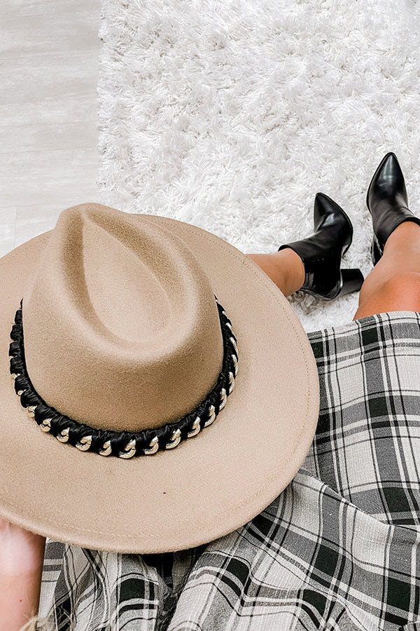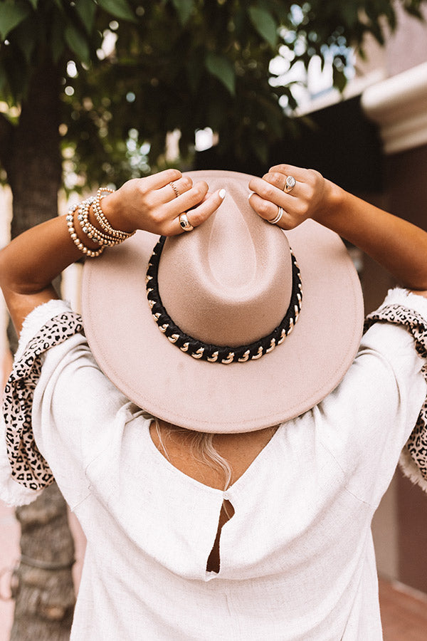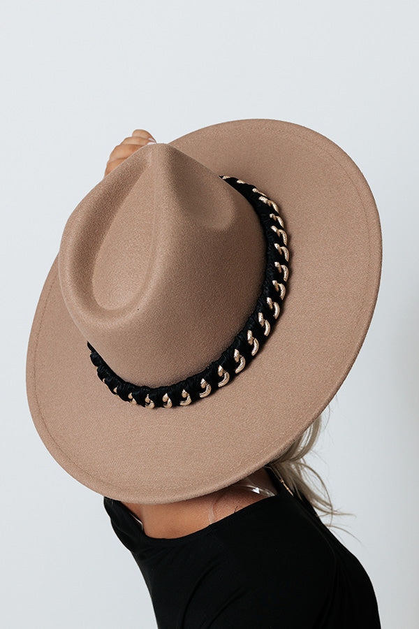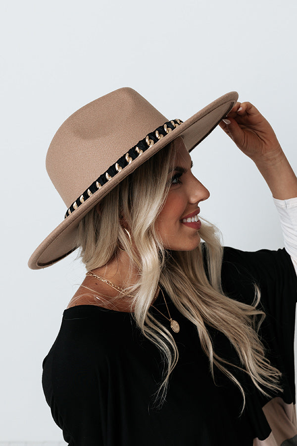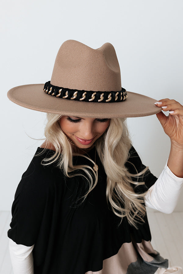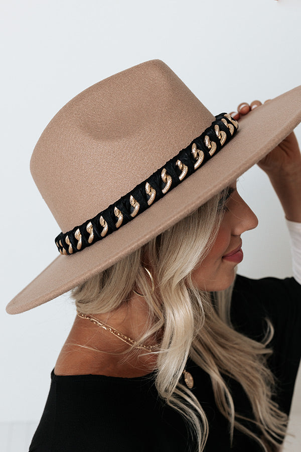 You are sure to have a perfect photo-worthy style moment when you top off your look with this light taupe hued fedora featuring lightweight material, a stiff 4-inch accent band, and a wide black accent band with a gold chain detail!