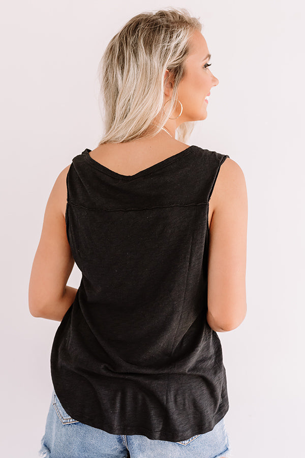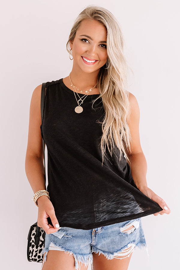 Stay carefree in this crush worthy black top featuring soft ultra lightweight material, a high rounded neckline, wide 2-inch sleeveless shoulder straps, and a relaxed silhouette that falls into a rounded hemline that looks adorable knotted! This upscale basic styles perfectly with some distressed denim shorts, matching block heels, and a leopard crossbody, but you can also wear it layered under our "Away She Goes Leopard Overlay" with some white flares, "The Bowen Wedge in Blush," and our "All Caught Up Headband in Pink!" Measurements